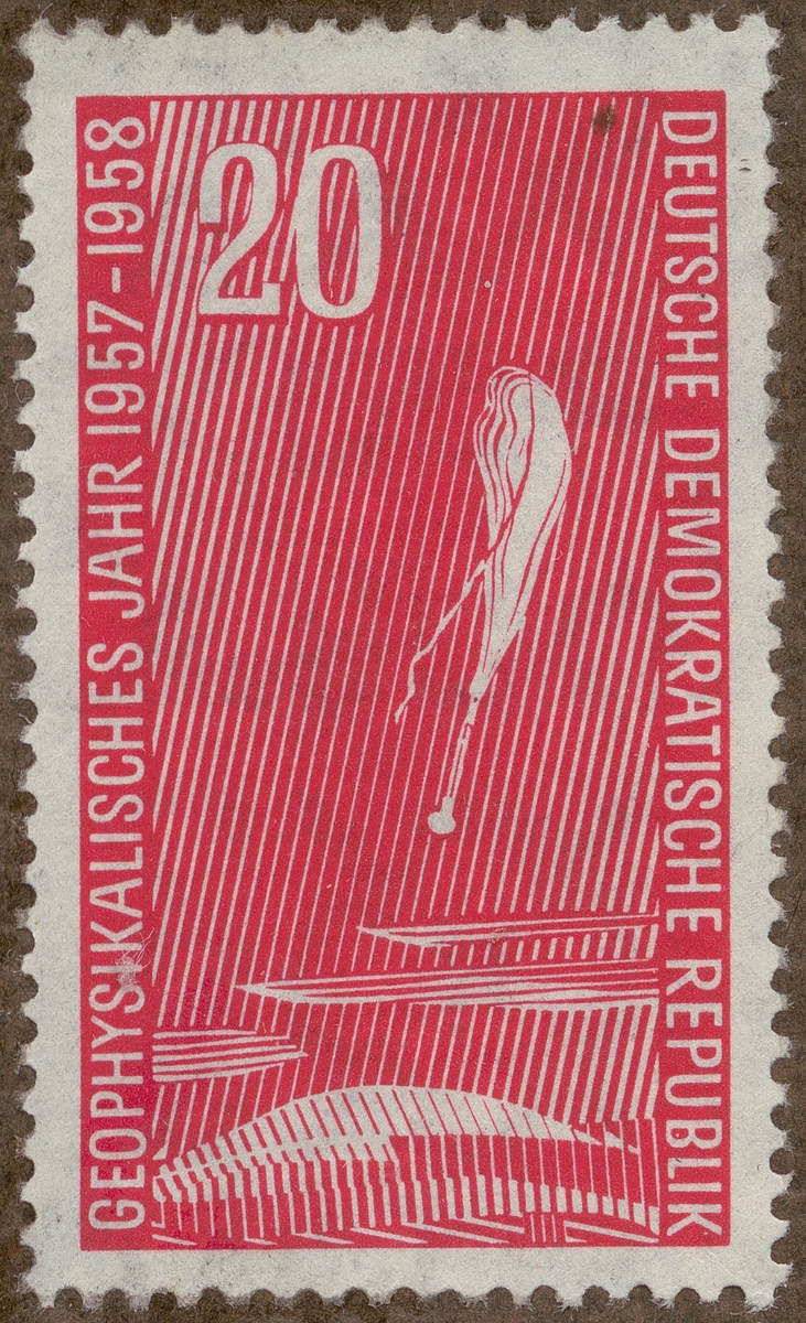 Frimärke från Öst Tyskland, 1957. Motiv av Stratosfär Ballong "Geofysiska året 1957-1958"