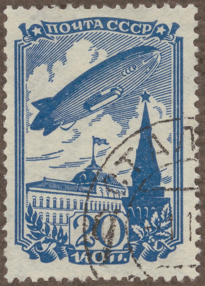 Frimärke från Ryssland, 1938. Motiv av Långsmal ballong av Zeppelintyp över Kremlin. "Serie: Till Sovjetflygets ära"