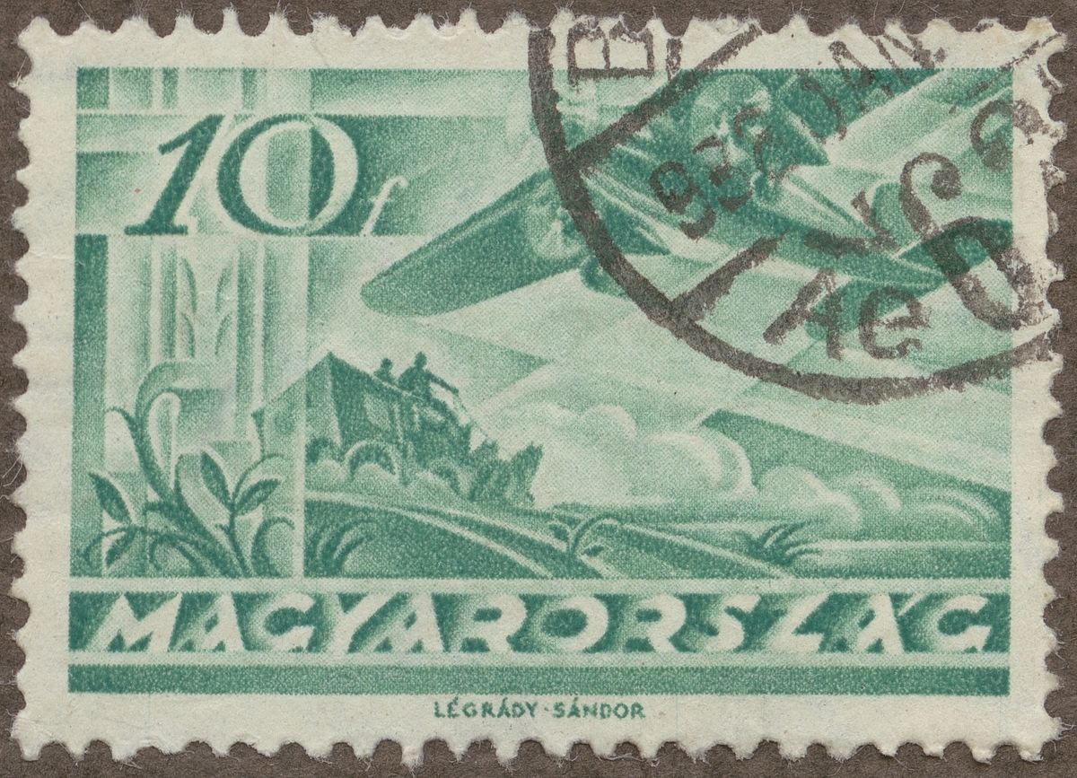 Frimärke från Ungern, 1936. Motiv av Flygplan och diligens i Ungern. "-Flygplan serie.-" Luftpost.