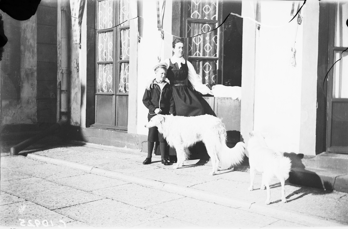 Drottning Victorias bilder. Drottning Victoria i Tullgarnsdräkt, med prins Erik och två hundar på Tullgarns slott.