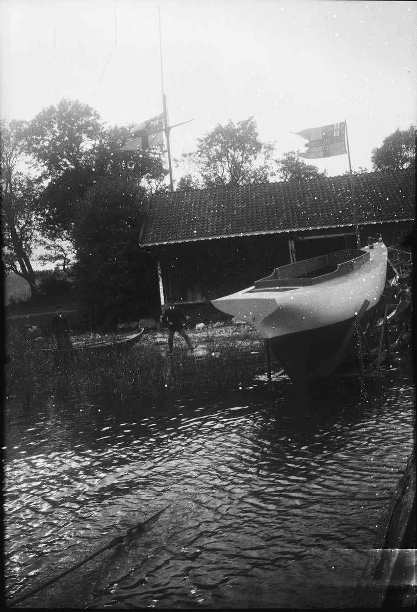 Drottning Victorias bilder. Prins Gustav Adolf och greve Göran Posse byggde en segelbåt, 1904, på Tullgarn med hjälp av en båtbyggare. Här sjösättes båten "Sif".