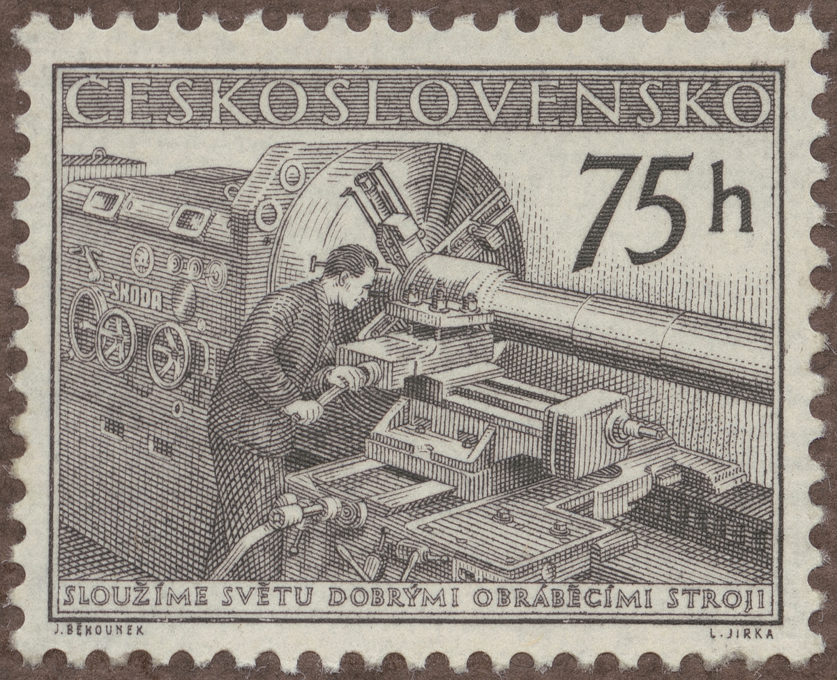 Frimärke från Tjeckoslovakien, 1955. Motiv av Svarvning av en stor axel