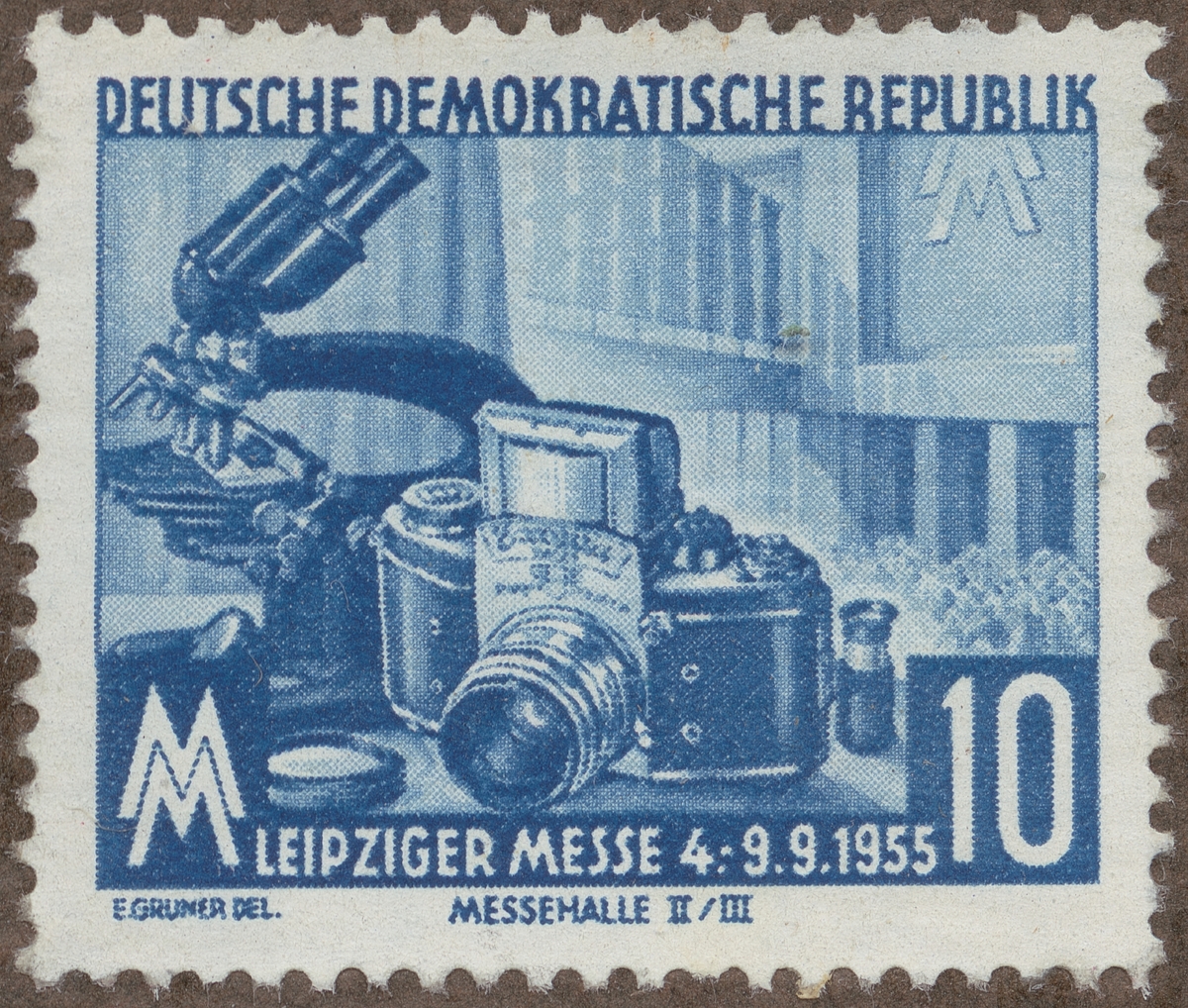 Frimärke från Östtyskland, 1955. Motiv av Optiska Instrument Mikroskop Kamera Kikare Leipzigermässan 4.9.1955