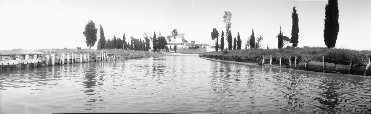 Drottning Victorias bilder. Panorama över ett vattendrag genom bebyggelse?