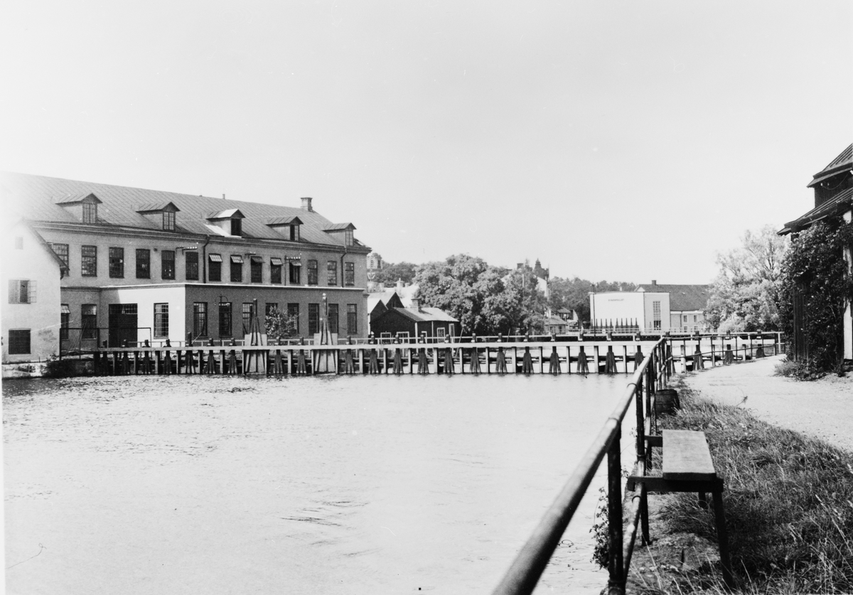 Exteriör av Holmens bruk. Det kubkantiga huset i bakgrunden är stadens elektricitetsverk.
