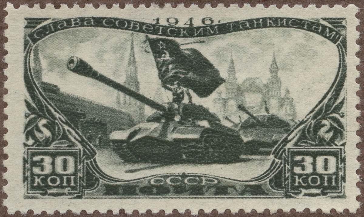 Frimärke från Ryssland, 1946. Motiv av Rysk pansartank på Röda Torget i Moskwa.