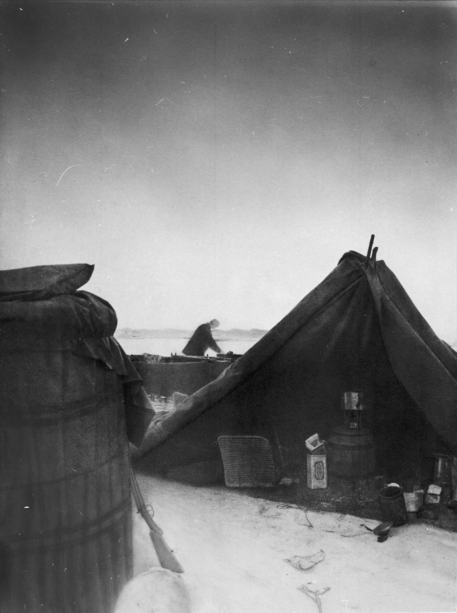 Lägret vid "Örnens" landningsplats. Till vänster gondolen, till höger tältet. Mellan dem skymtar båten. I tältet ses proviant och kokkärl. I mitten kokapparat och till vänster en proviantkorg. Framtagning av bilderna gjordes av docent John Hertzberg år 1930 på Fotografi, Tekniska Högskolan.