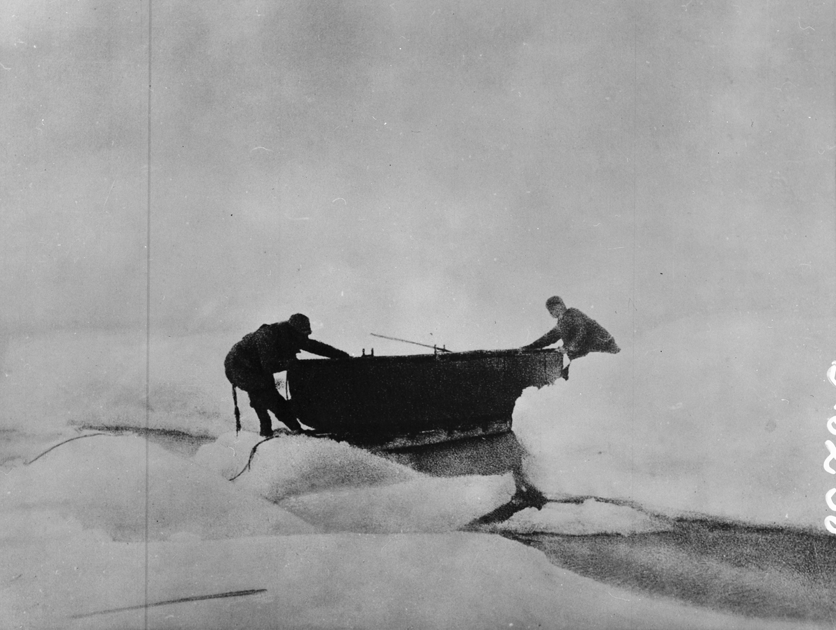 Fraenkels kälke drages fram med båten mellan isblocken. Till höger Andrée, till vänster Fraenkel. Framtagning av bilderna gjordes av docent John Hertzberg år 1930 på Fotografi, Tekniska Högskolan.