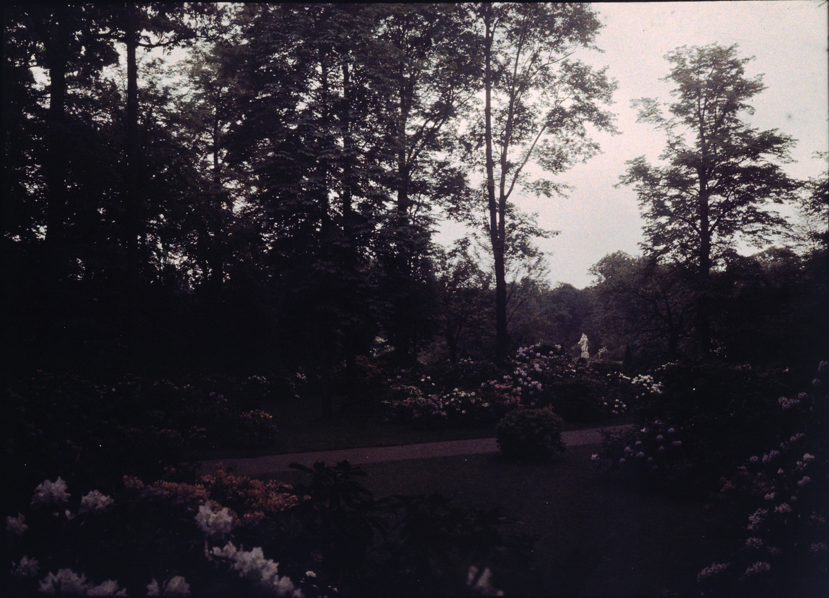 Lumières-autokrom. Stor trädgårdsodling av rododendron i Dresden. Fotograferad den 31 maj 1910 kl 9 00 med f/12, 5 sek. exponering.