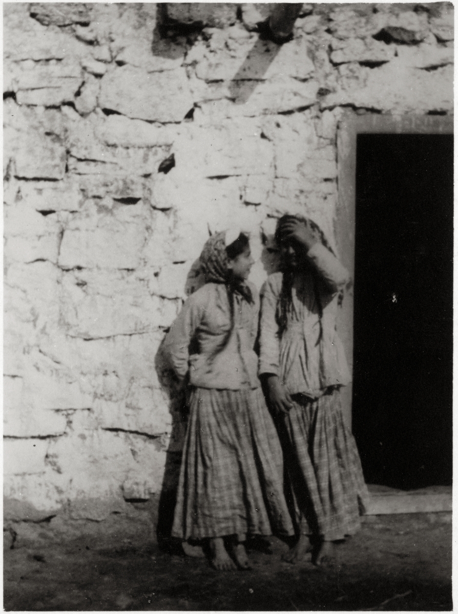 Bild från Baku's omgivningar.Två kvinnot vid en husvägg.