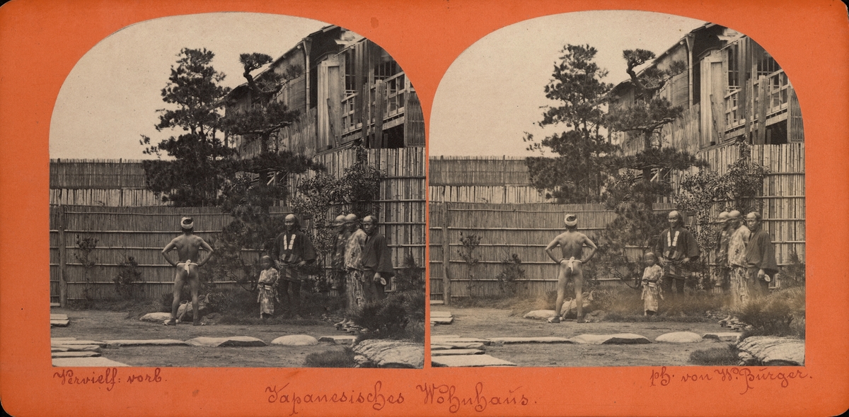 Stereobild av bakgård med 5 män och ett barn i Japan.