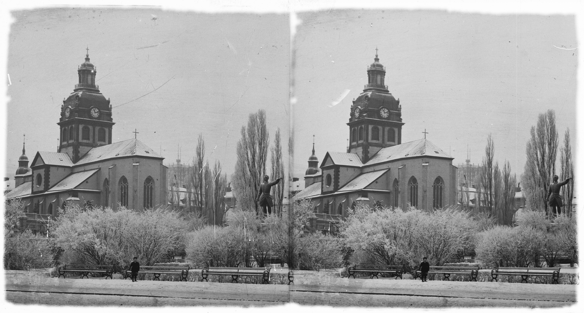 Transparent stereoskopbild på glas med motiv från Stockholm, Karl XII:s Torg och Jacobs kyrka i rimfrost.