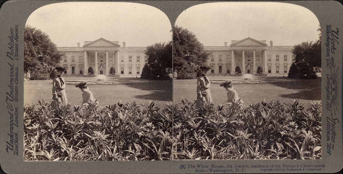 Stereobild av två kvinnor i trädgården framför Vita Huset.