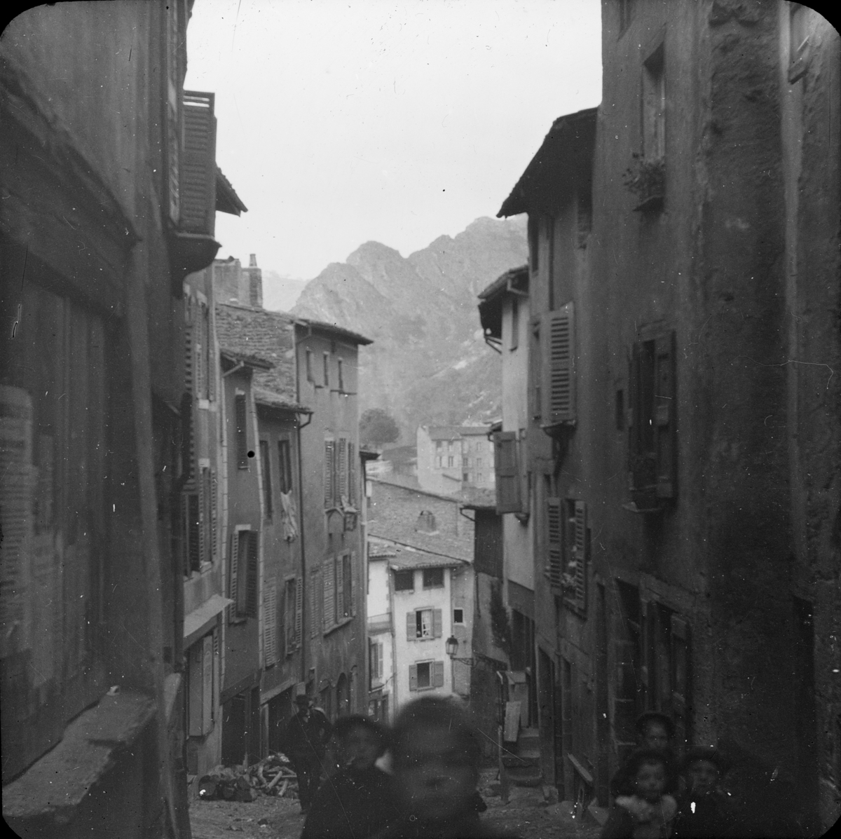 Titel: Skioptikonbild med motiv från gränd i Vichy. Bilden har förvarats i kartong märkt: Thiers