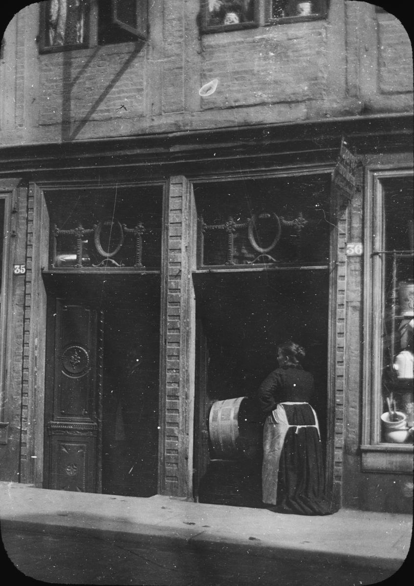 Skioptikonbild med motiv av kvinna vid port till okänt hus, okänd stad.
