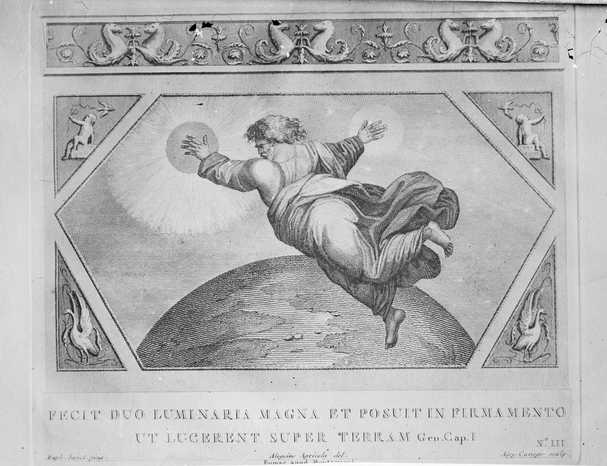 Skioptikonbild. Tryck med motiv av skapelseberättelsen på dag 4. Gud gjorde de två stora ljusen, det större ljuset till att härska över dagen och det mindre till att härska över natten, och han gjorde stjärnorna. Han satte ljusen på himlavalvet att lysa över jorden, att härska över dag och natt och att skilja ljus från mörker. Och Gud såg att det var gott. Det blev kväll och det blev morgon.