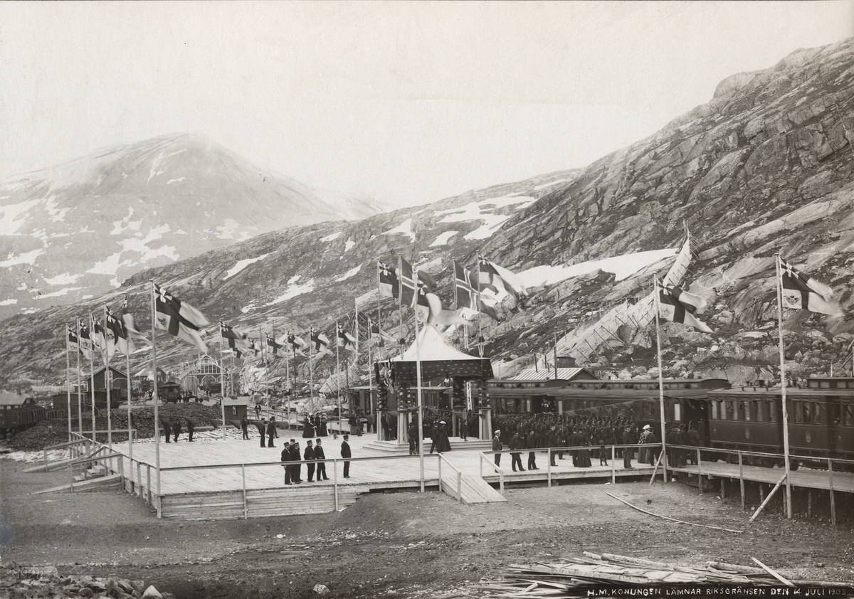 Från Riksgränsbanans byggnation: Riksgränsens station, dekorerad med svenska och norska flaggorna i topp vid invigningen den 14 juli 1903. Invigningståget med kung Oscar lämnar stationen för att fortsätta till Narvik.