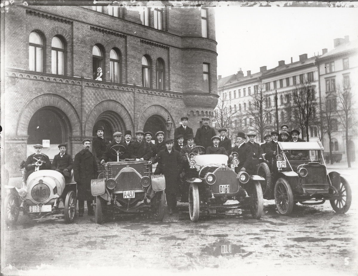 Elever vid Eric Lundviks körskola, samlade kring fyra automobiler framför huset Karlaplan 10, omkring 1915-1920.