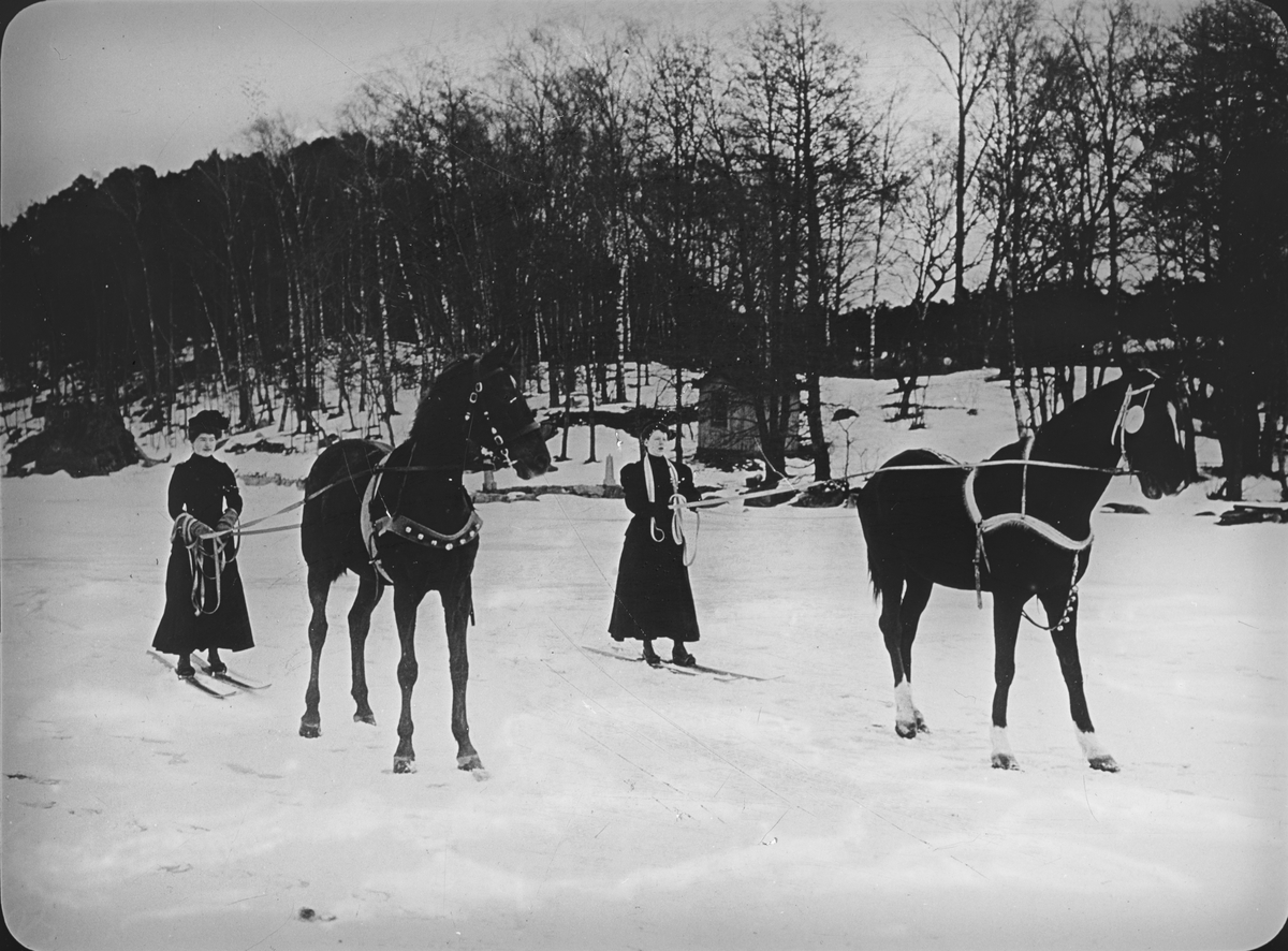 Projektionsbild. Vintersport. Sidåkning efter häst.