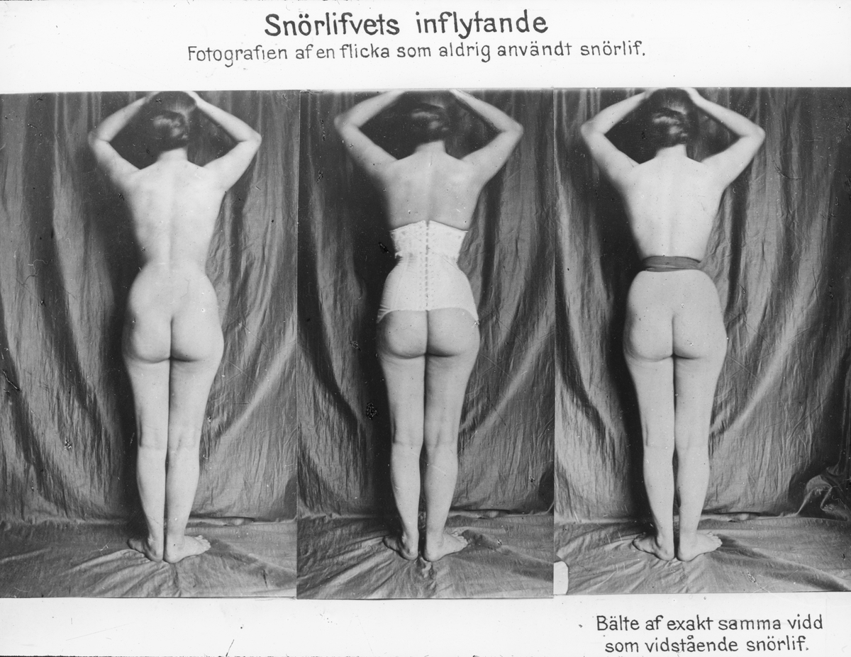 Skioptikonbild med motiv från Arbetarskyddsstyrelsen arbetsplatsdokumentationer. Snörlivets inflytande (snörlifvet). Bilder av en flicka som aldrig använt snörliv.