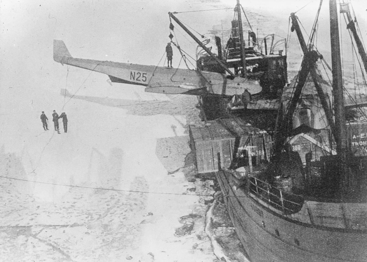 Skioptikonbild med motiv av flygplan. Bergning av flygplan från isen.