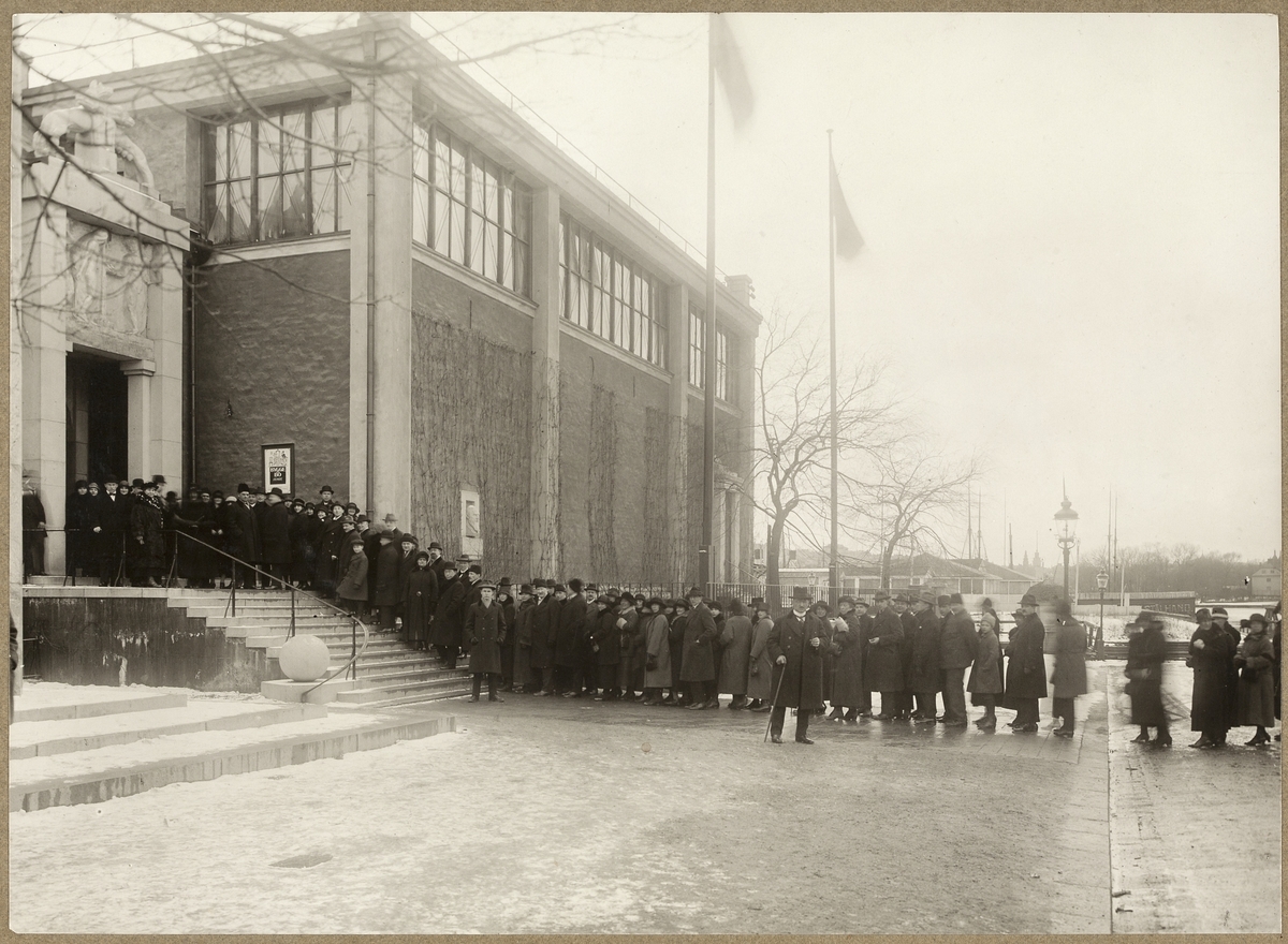 Bygge och Bo-utställningen på Liljevalchs 1925. Köbildning utanför Liljevalchs. Petrus Wretblad som var utställningens kommissarie, poserar i förgrunden.