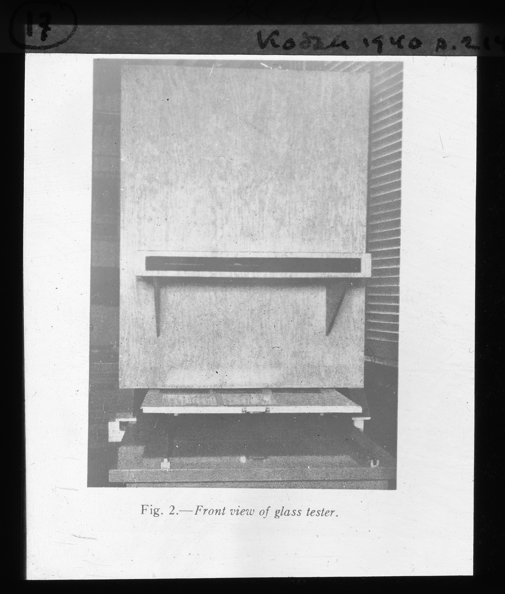 Skioptikonbild från Institutionen för fotografi vid Kungliga Tekniska Högskolan. Använd av professor Helmer Bäckström som föreläsningsmaterial. Bäckström var Sveriges första professor i fotografi vid Kungliga Tekniska Högskolan i Stockholm 1948-1958.