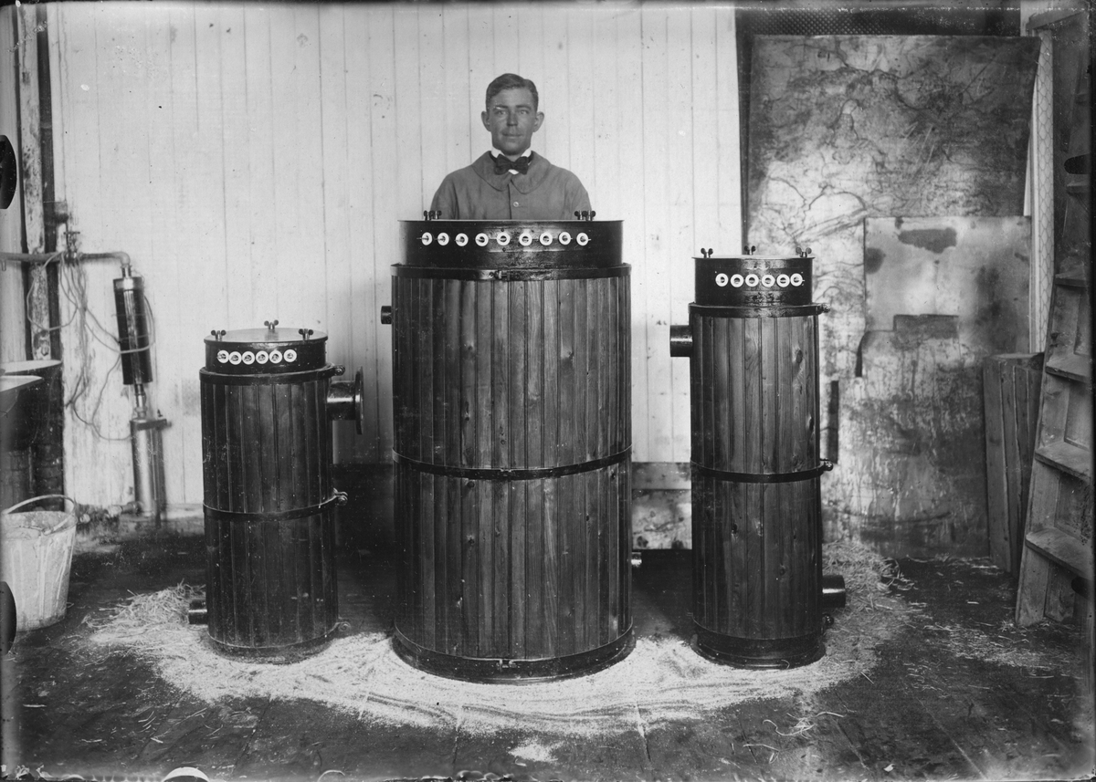 Fotografi ur album av Hjalmar Löfquists patenterade elektriska ång- och varmvattenpannor, för industrier, kraftverk och bostäder. Ångpannor: 132 på 20 k.w, 133 på 40 k.w. och 135 på 25 k.w.