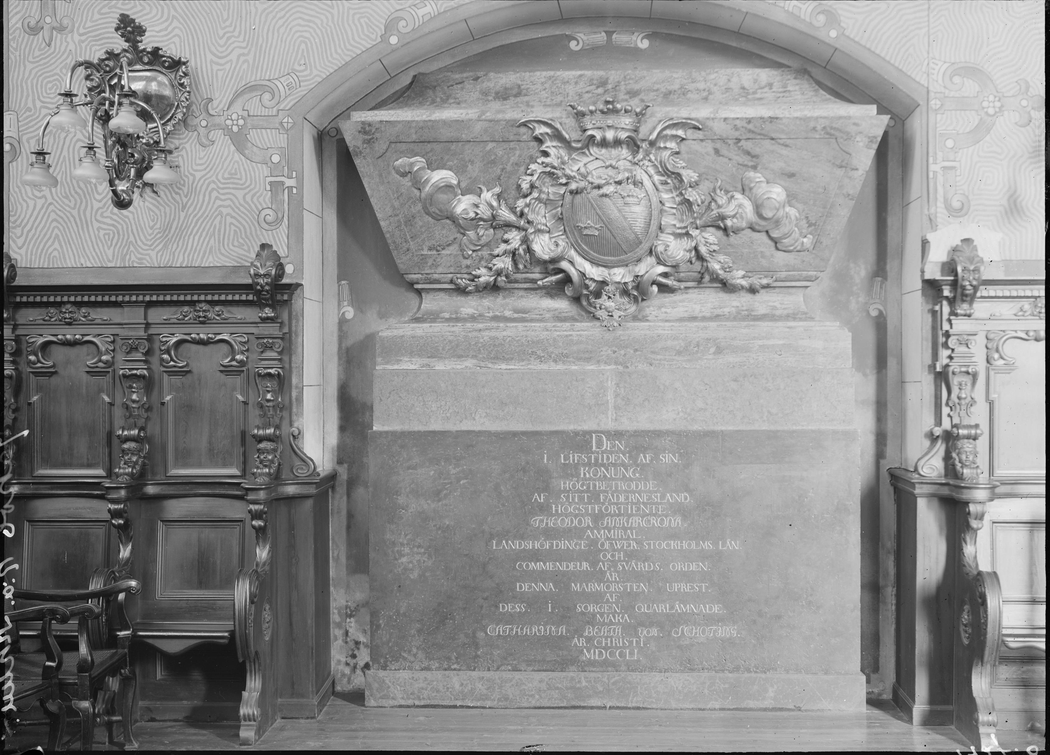 Gravmonument över Theodor Ankarcrona, uppsatt 1751, av marmor och metall, möjligen efter ritningar av Carl Hårleman, på korets södra sida.