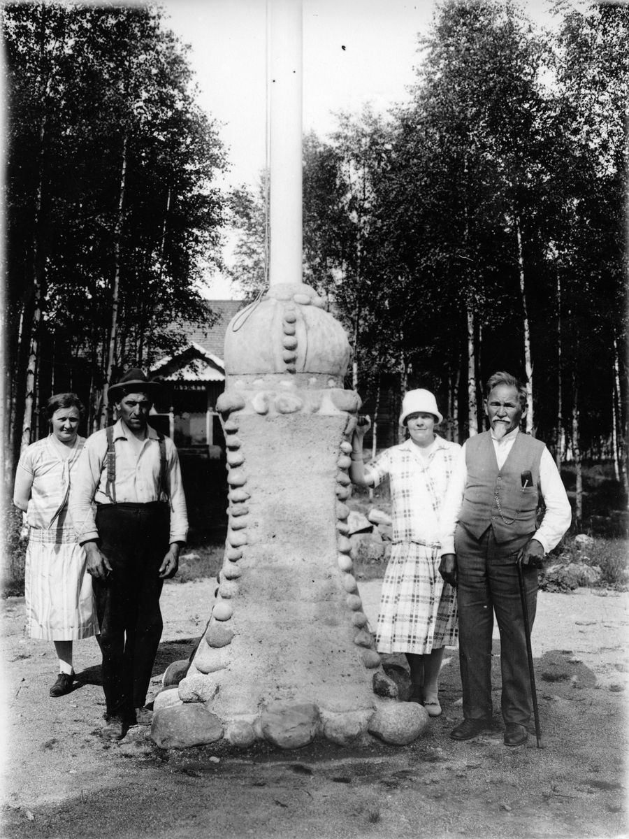 Carl Richard Nyberg, kallad Flyg-Nyberg (längst till höger i bilden)), tillsammans med flera personer. Bilden lämnad till Tekniska Museet av fru Greta Broberg, Stockholm, genom filmhistoriska samlingarna jan. 1952.