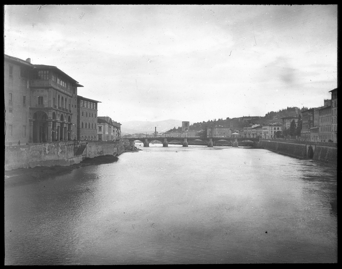 Skioptikonbild från institutionen för fotografi vid Kungliga Tekniska Högskolan. Vy från Ponte Vechio (Den gamla bron) över floden Arno i staden Florens, Italien. Bilden är troligen tagen av John Hertzberg under en resa i Europa.