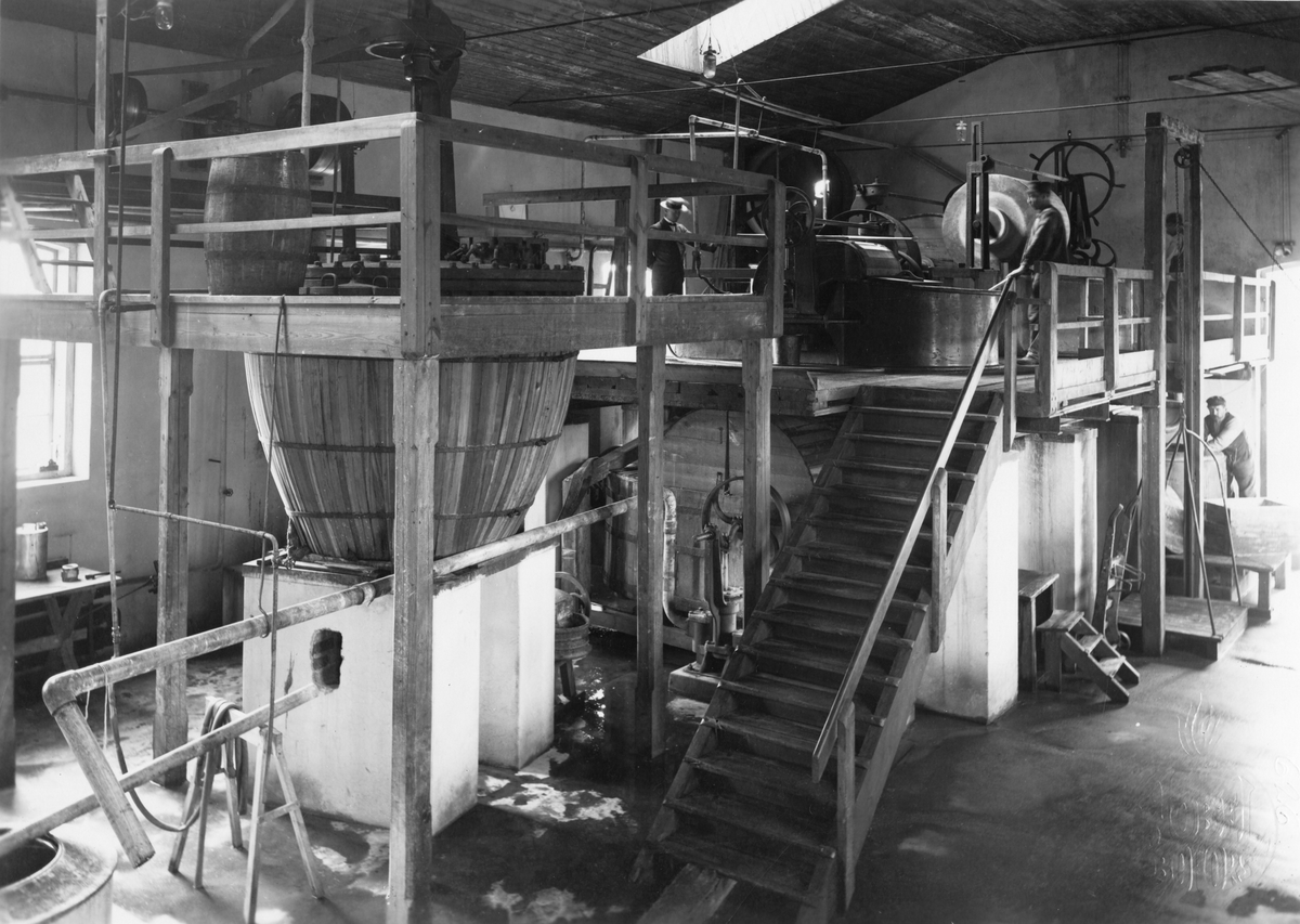 AB Bofors Nobelkrut. Malning av bomullskrut (nitrocellulosa). På läktaren till höger står två så kallade holländare av samma typ som användes vid pappersbruken. Till vänster en kokare för särskilda experiment. 1905.