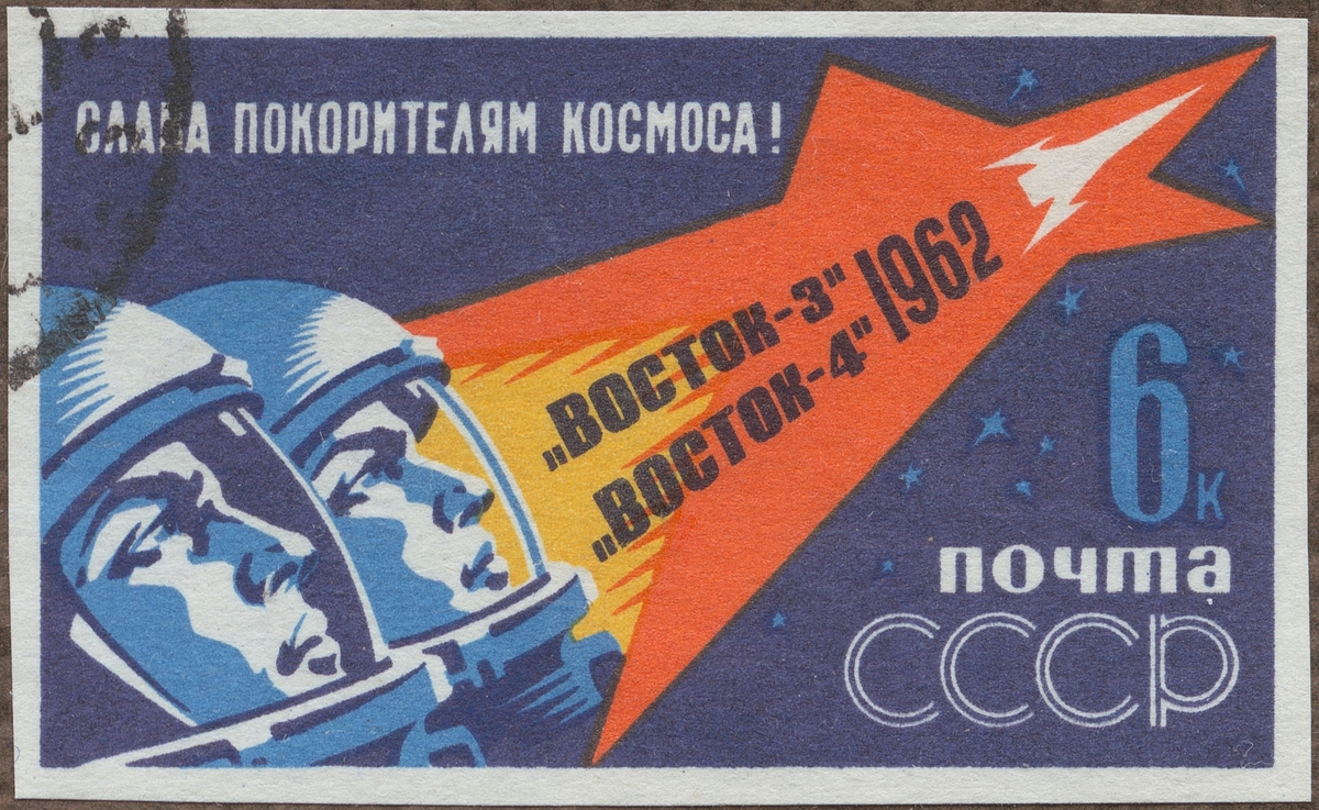 Frimärke från Rumänien, 1962. Motiv av (t.v.) Kosmonauten A. Nikolajev (t.h.) Kosmonaut P. Popovitj i parflygning med rymdskeppen Vostok 3 och 4 12-15 augusti 1962. "-Astronautik serie-"