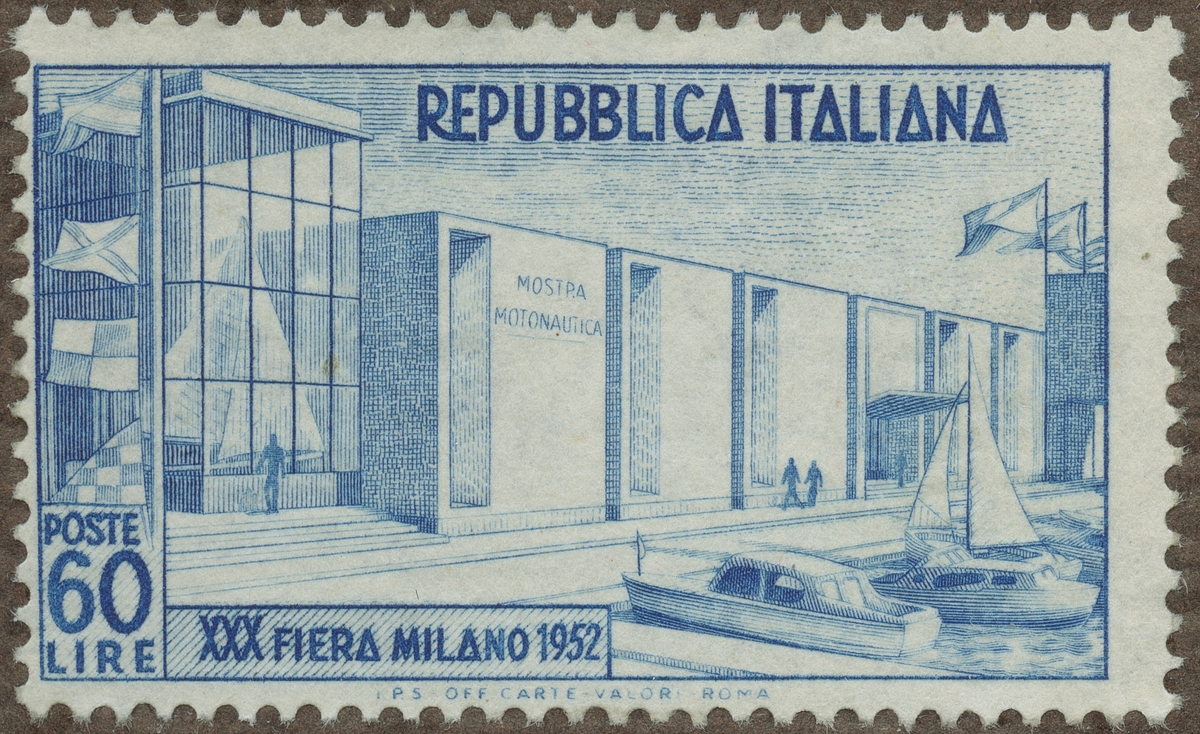 Frimärke från Italien, 1952. Motiv av Utställningsbyggnad -30-de mässan i Milano 1952-