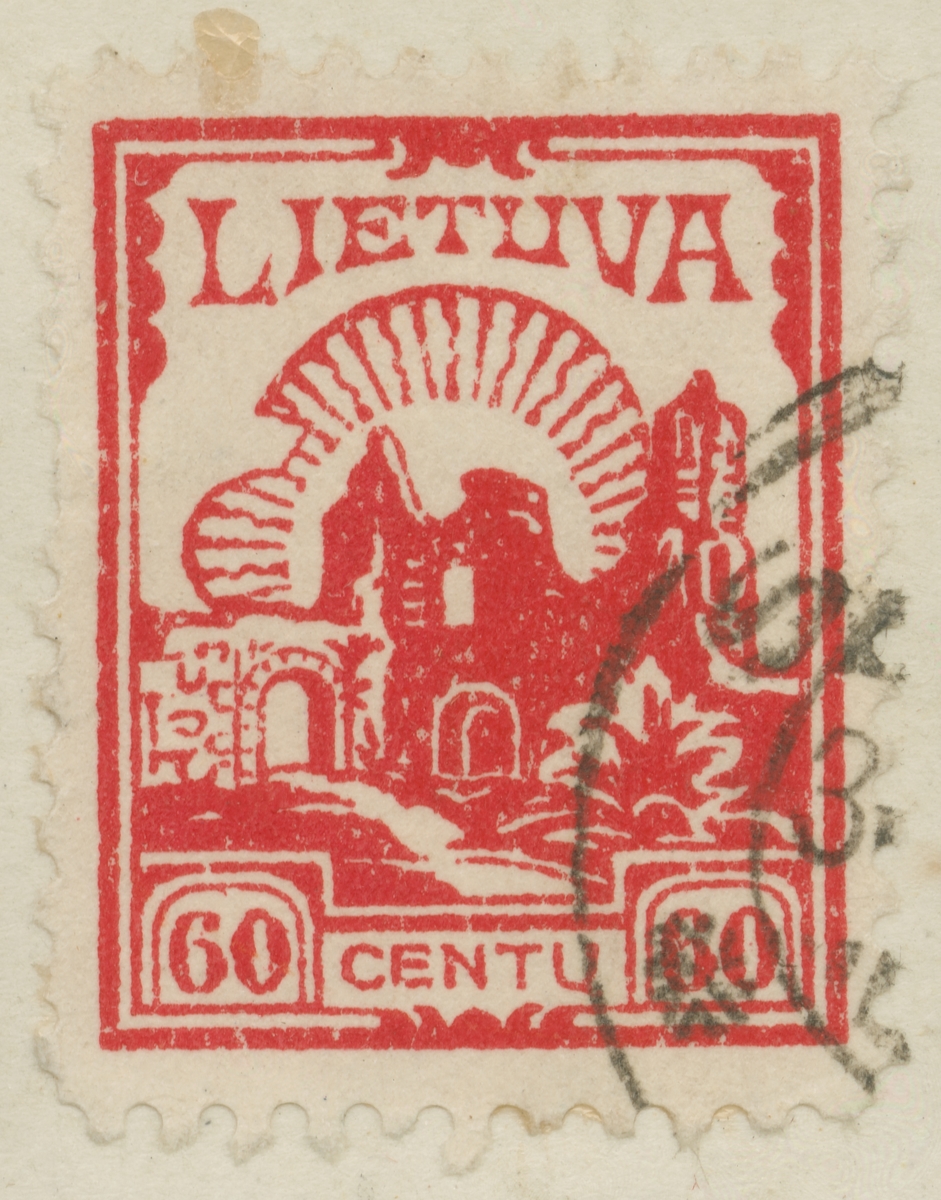 Frimärke från Litauen, 1923. Motiv av borgruin i Kaunas.