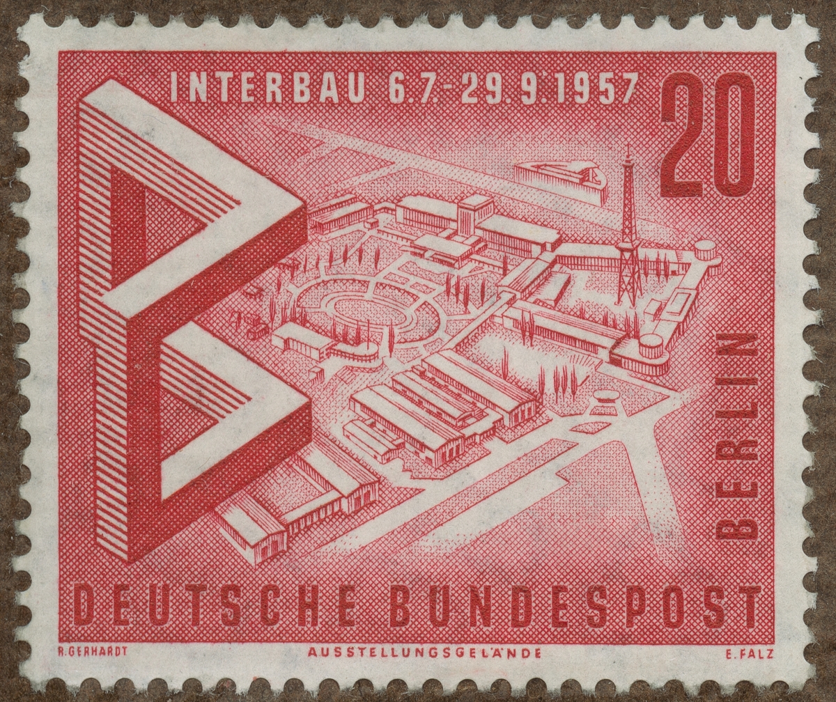 Frimärke från Västtyskland, 1957. Motiv av Interbau utställningen Berlin 6.7-29.9 1957