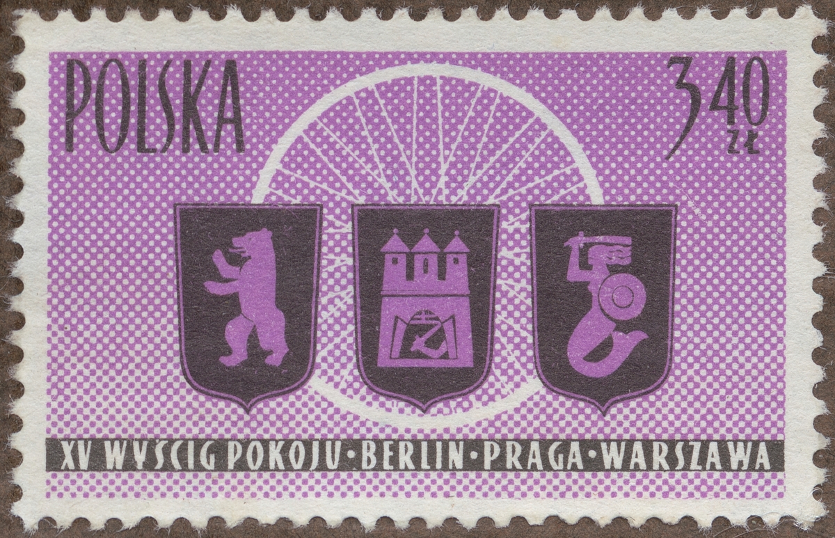 Frimärken ur Gösta Bodmans filatelistiska motivsamling, påbörjad 1950. Frimärke från Polen, 1962. Motiv av Stadsvapen: Berlin-Prag-Warshawa och - cykelhjul - "15-nde internationella cykeltävling: Berlin-Prag-Warshawa"