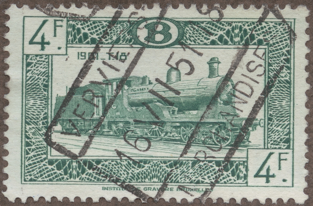 Frimärken ur Gösta Bodmans filatelistiska motivsamling, påbörjad 1950. Frimärke från Belgien, 1949. Motiv av Lokomotiv Belgien 1901 T. 10