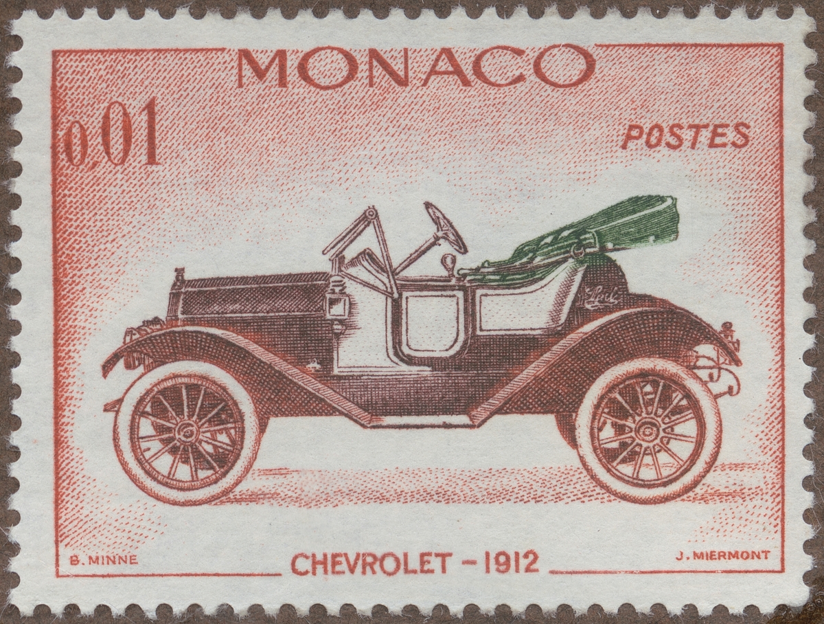 Frimärken ur Gösta Bodmans filatelistiska motivsamling, påbörjad 1950. Frimärke från Monaco, 1961. Motiv av Chevrolet: 1912