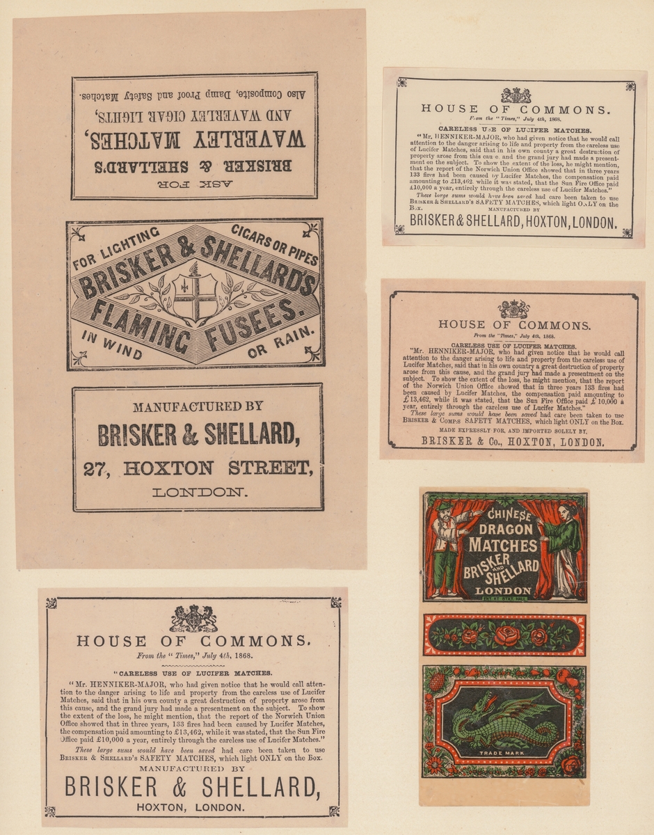 Titel: Etiketter för tändsticksaskar, från Svenskt Industri- och Handelsmuseum. (Brisker & Shellard's).