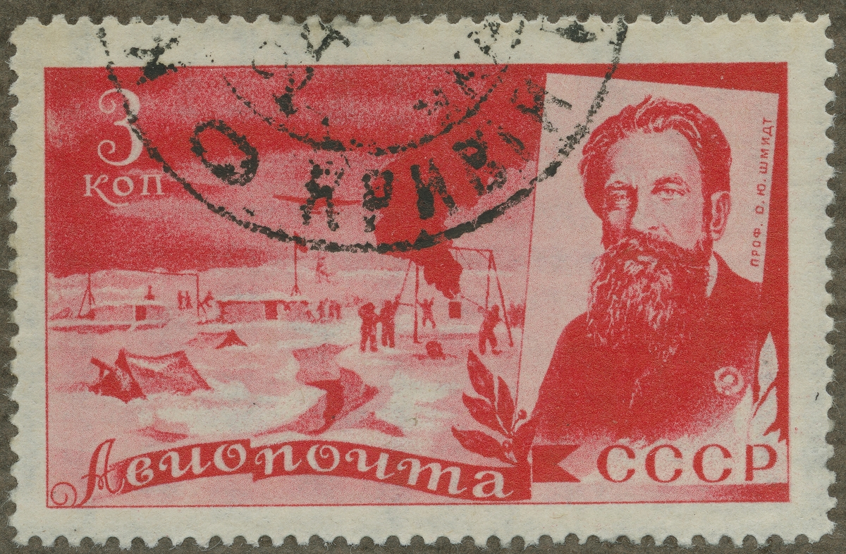 Frimärke från Ryssland, 1935. Motiv av Ryskt vinterläger på isen utanför Kap Tscheljuskin. (t.h.): Professor Otto Y. Schmidt