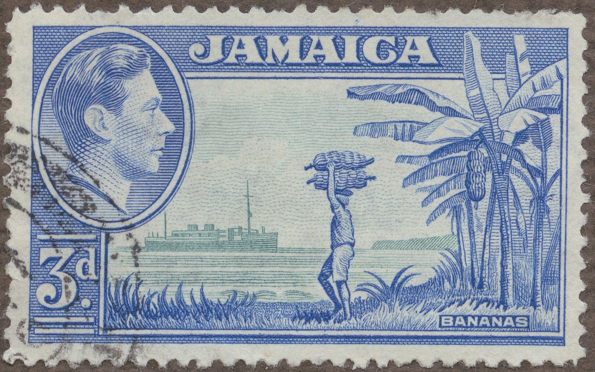 Frimärke från Jamaica, 1938. Motiv av bananplanta. Kung George VI.