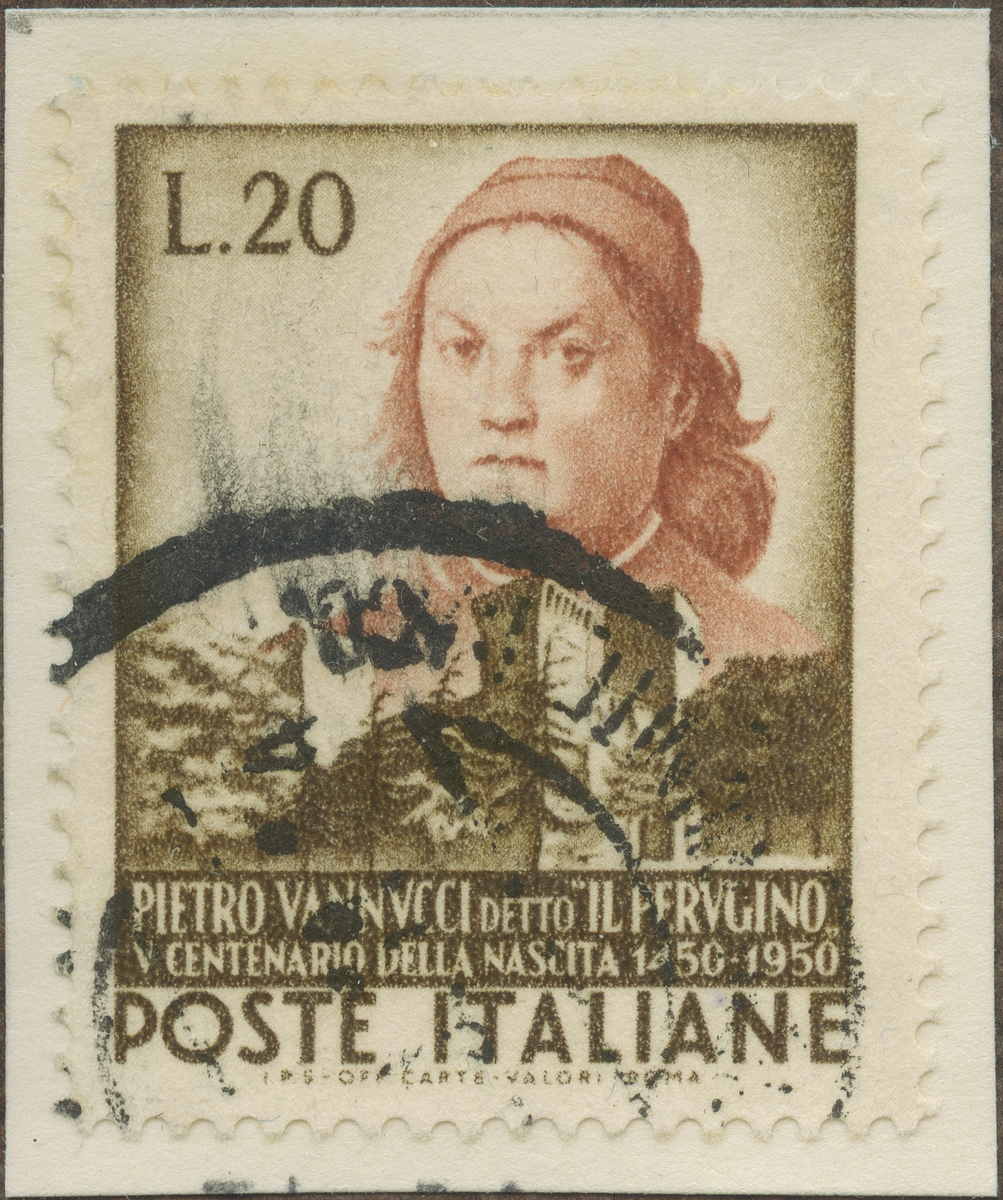 Frimärke från Italien, 1951. Motiv av Pietro Christoforo Vannucci- kallad "Il Perugino"- Målaren 1450-1532. 500-årsminne av hans födelse.