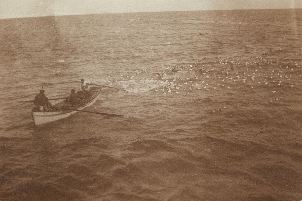 Fotografi från första svenska Antarktisexpeditionen 1901-1904. Motiv av tre män i en liten träbåt ute på havet. Bredvid båten simmar en flock med fåglar.