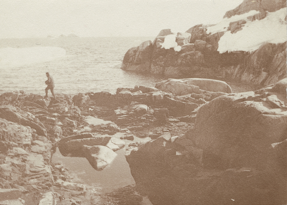 Fotografi från första svenska Antarktisexpeditionen 1901-1904. Vy över stenig strand, hav och snö.