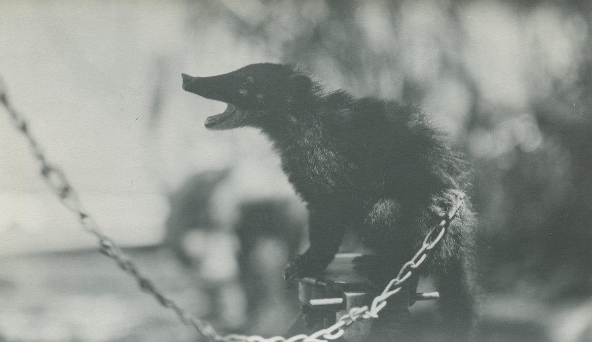 Fotografi från expedition till Peru 1920. Motiv av en fastkedjad bisamråtta.