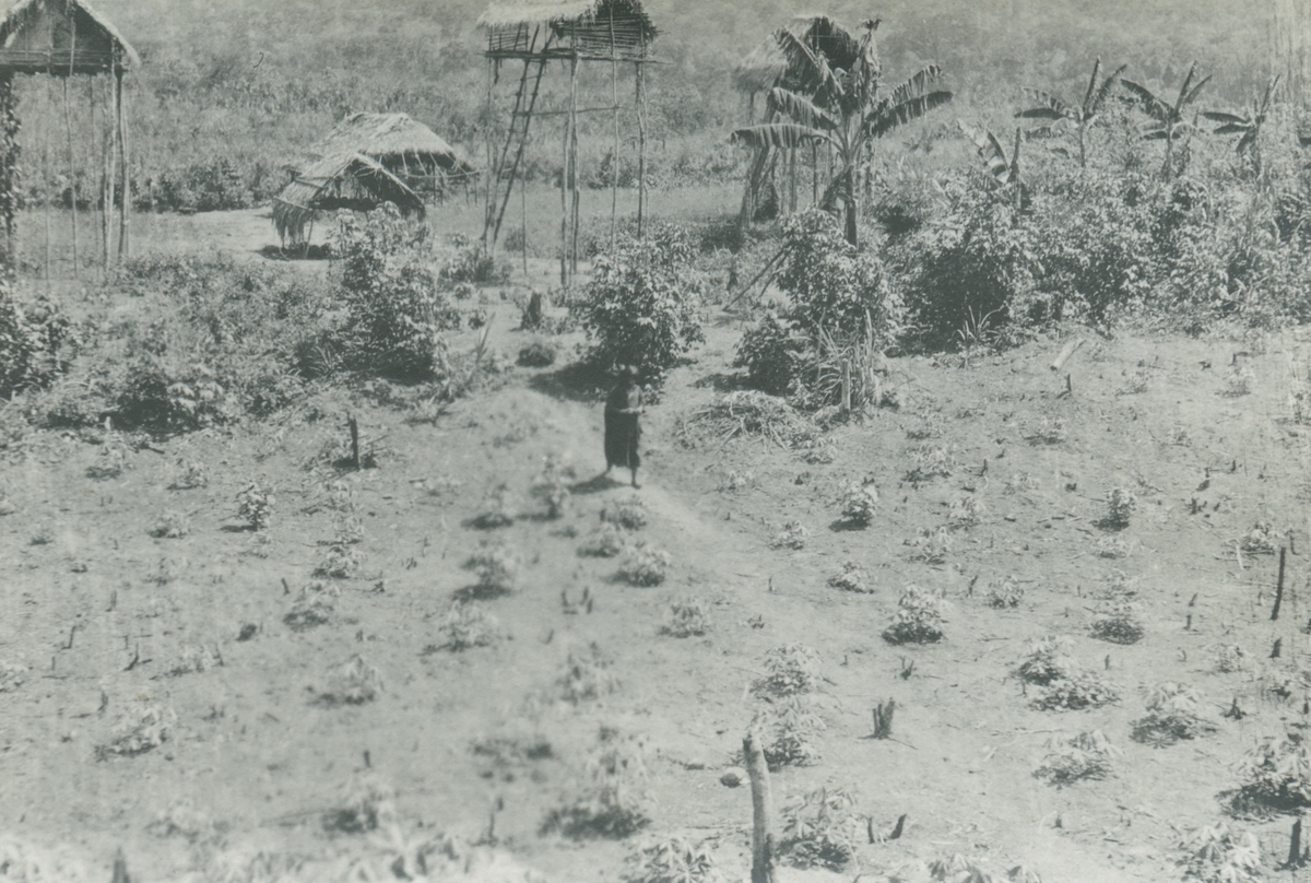 Fotografi från expedition till Peru 1920. Motiv av person vid hyddor i djungeln.