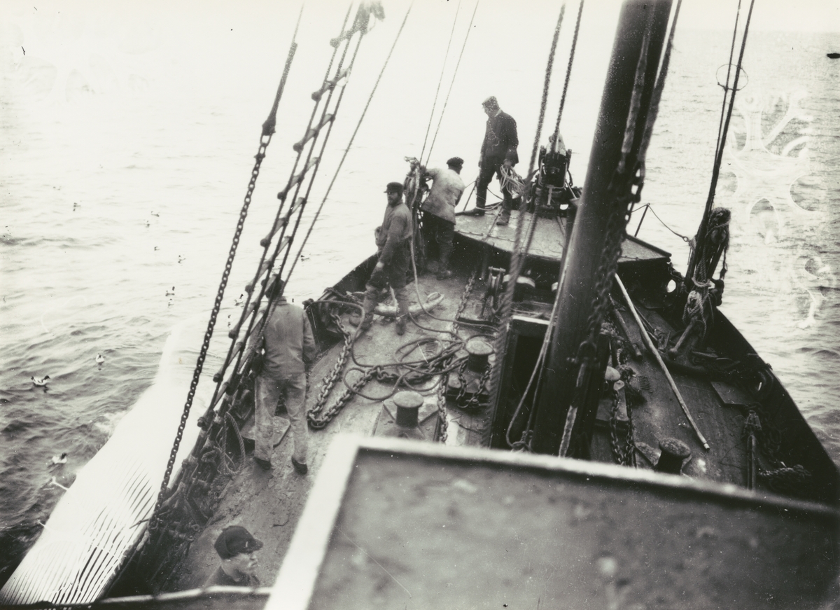 Bild från expedition i Antarktisområdet. Motiv av båt med besättning, 1912.