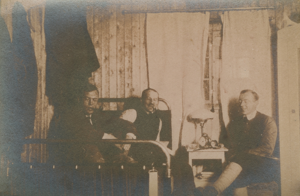 Fotografi från expedition till Spetsbergen. Tre män umgås inomhus och röker pipa.
