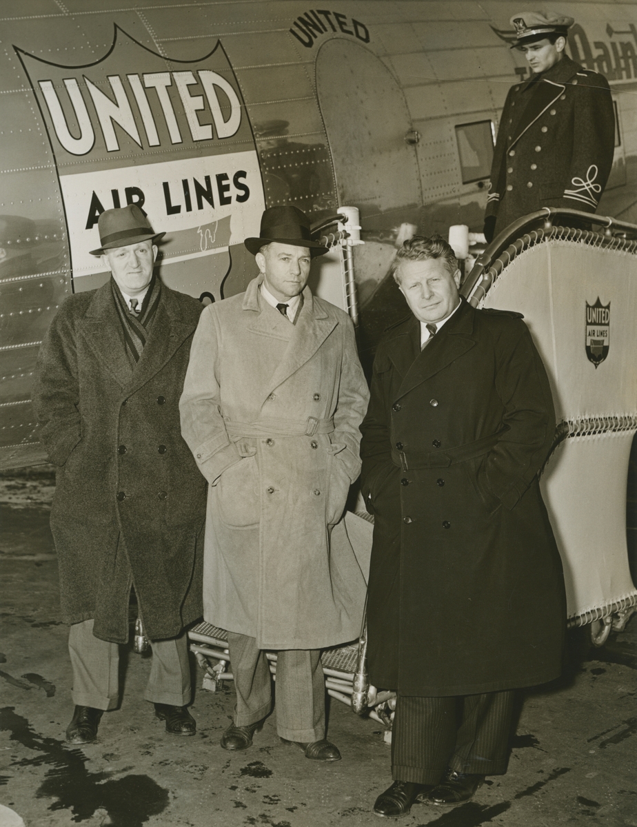 Fotografi från låda märkt Bernt Balchen. Balchen var norsk-amerikansk flygare, polarforskare och militär. Motiv av tre män som står framför ett flygplan tillhörande United Air Lines. Mannen längst till höger är Bernt Balchen.